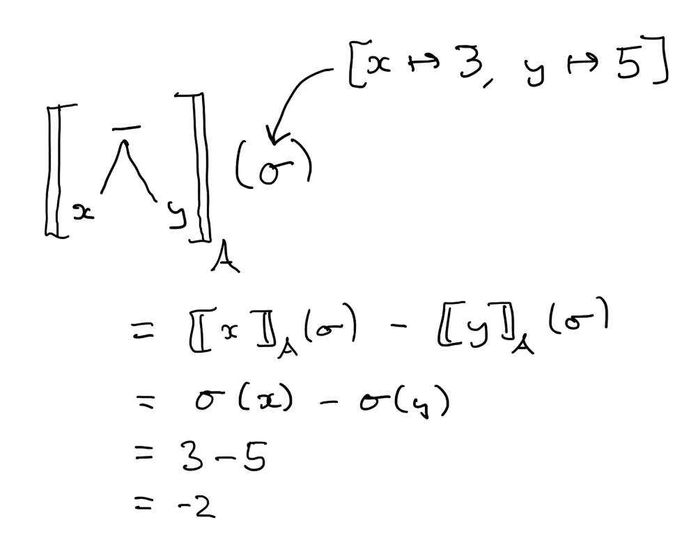 Let’s work though an example. The denotation $\llbracket x \mathbin{\underline{*}} \underline{2} \rrbracket_A(\sigma)$ evaluates to $\llbracket x \rrbracket_A(\sigma) * \llbracket \underline{2} \rrbracket_A(\sigma)$, which ultimately is equivalent to $\sigma(x) * 2$. To evaluate this further, we need to know the value $\sigma$ assigns to $x$. If we take $\sigma$ to be the state $[x \mapsto 2]$, then the denotation of our expression ultimately evaluates to $4$.