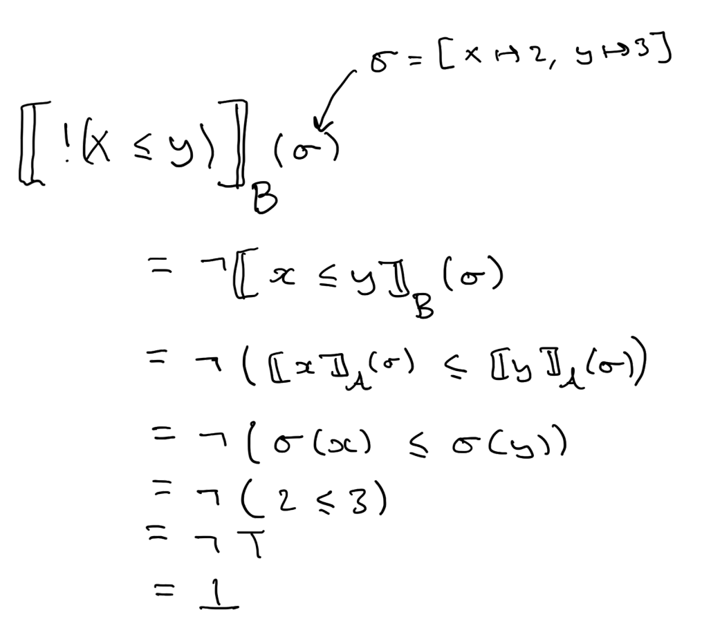 \[\begin{array}{rl} \llbracket \tt \rrbracket_\mathcal{B}(\sigma) & = \top\\ \llbracket \ff \rrbracket_\mathcal{B}(\sigma) & = \bot\\ \llbracket \mathop{!}e \rrbracket_\mathcal{B}(\sigma) & = \neg \llbracket e \rrbracket_\mathcal{B}(\sigma)\\ \llbracket e_1 \andop e_2 \rrbracket_\mathcal{B}(\sigma) & = \llbracket e_1 \rrbracket_\mathcal{B}(\sigma) \wedge \llbracket e_2\rrbracket_\mathcal{B}(\sigma)\\ \llbracket e_1 \orop e_2\rrbracket_\mathcal{B}(\sigma) & = \llbracket e_1 \rrbracket_\mathcal{B}(\sigma) \vee \llbracket e_2 \rrbracket_\mathcal{B}(\sigma)\\ \llbracket e_1 = e_2 \rrbracket_\mathcal{B}(\sigma) & = \llbracket e_1 \rrbracket_A(\sigma) = \llbracket e_2 \rrbracket_A(\sigma)\\ \llbracket e_1 \leq e_2 \rrbracket_\mathcal{B}(\sigma) & = \llbracket e_1 \rrbracket_A(\sigma) \leq \llbracket e_2 \rrbracket_A(\sigma) \end{array}\]This function is also defined by recursion over the structure of the Boolean expressions, replacing syntactic constructs with their mathematical counterpart, and thus is well-defined. Notice additionally that we are using the denotation function for arithmetic expression in this definition. For example, the following application of the denotation function for Boolean expressions depends on the denotation of arithmetic expressions. Here we use a flat representation of expressions, although they are still to be interpreted as abstract syntax trees.