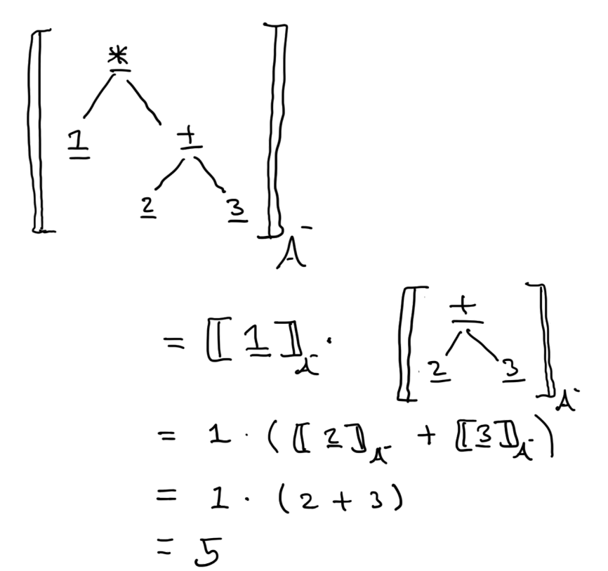 \[\begin{array}{rl} \llbracket \underline{n} \rrbracket_{\mathcal{}^-} & = n \\ \llbracket e_1 \mathbin{\underline{+}} e_2 \rrbracket_{\mathcal{A}^-} & = \llbracket e_1 \rrbracket_{\mathcal{A}^-} + \llbracket e_2 \rrbracket_{\mathcal{A}^-} \\ \llbracket e_1 \mathbin{\underline{-}} e_2 \rrbracket_{\mathcal{A}^-} & = \llbracket e_1 \rrbracket_{\mathcal{A}^-} - \llbracket e_2 \rrbracket_{\mathcal{A}^-} \\ \llbracket e_1 \mathbin{\underline{*}} e_2 \rrbracket_{\mathcal{A}^-} & = \llbracket e_1 \rrbracket_{\mathcal{A}^-} \cdot \llbracket e_2 \rrbracket_{\mathcal{A}^-} \end{array}\]To be more precise, the denotation function is defined by recursion over the structure of expressions. That means that it uses the denotation of sub-expressions to build up a denotation for a compound expression. For example, the denotation of an expression $e_1 \mathbin{\underline{+}} e_2$ is calculated based on the denotation of the sub-expressions $e_1$ and $e_2$. Sometimes this is referred to as a compositional semantics as the semantics for an expression is defined by composing the semantics of its operators. Giving definitions by structural recursion in this manner is very common in semantics as it ensure that the function is well-defined. That is, every expression has a unique denotation according to our equations.