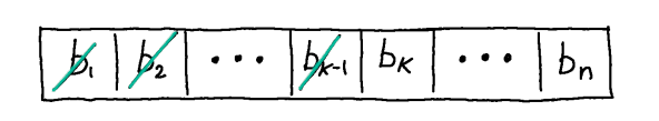 \[\begin{align*} S &\to \alpha_1\\ &\to \alpha_2\\ &\;\;\,\vdots{}\\ &\to b_1\ b_2\cdots{}b_{k-1}\ X\ \gamma \end{align*}\]ending with a sentential form that has some prefix of terminal symbols $b_1\ b_2 \cdots{} b_{k-1}$ followed by a non-terminal $X$ followed by some other stuff $\gamma$. If we’ve been crossing off letters have already been derived from the input string, then we are left aiming to derive next the letter $b_k$.